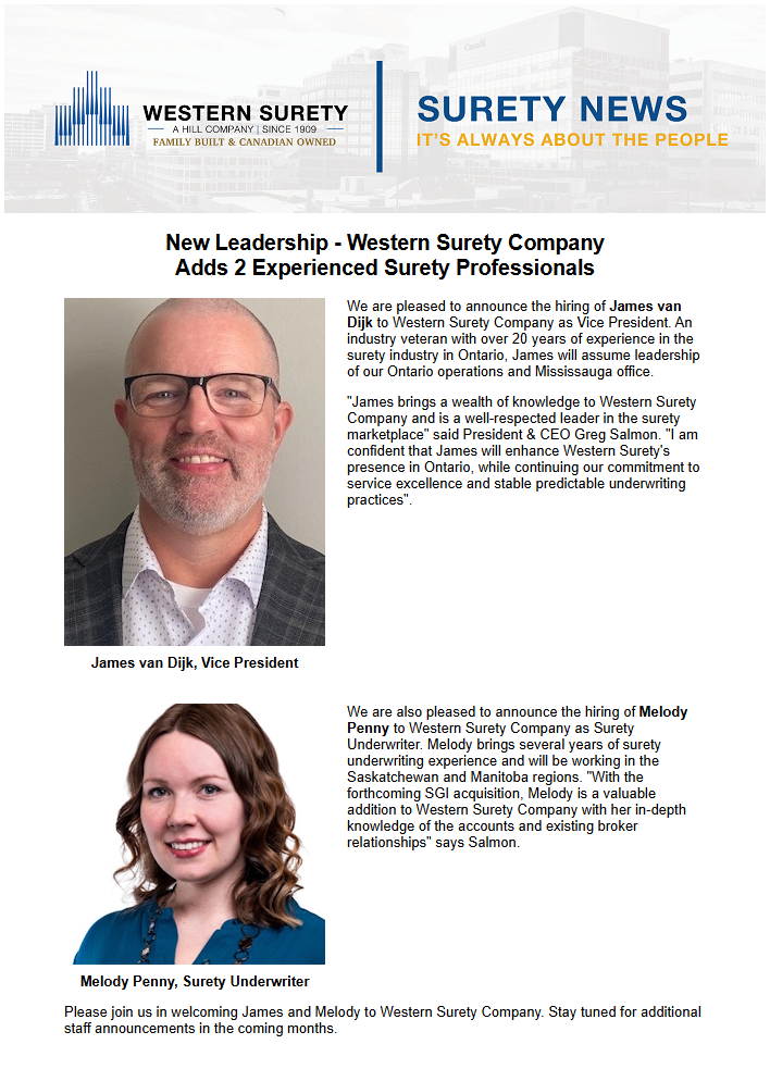 - 2025-09-19 – New Leadership – Western Surety Company Adds 2 Experienced Surety Professionals